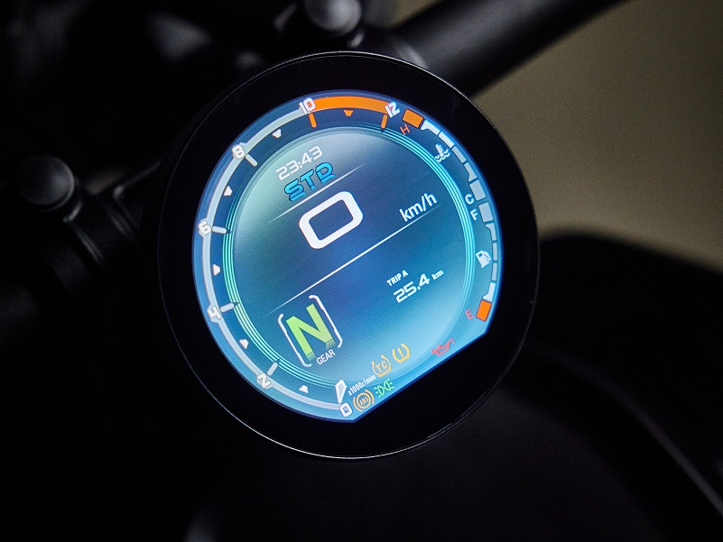 El panel TFT redondo, claro, legible y a color de la SRV 600 V muestra con claridad la velocidad actual, el régimen del motor, el cuentakilómetros parcial (ODO), el nivel de combustible del depósito, la temperatura del refrigerante, el indicador de marcha y, como novedad, la presión y la temperatura de los neumáticos gracias a los sensores que esta motocicleta incorpora en las ruedas. Las funciones se controlan y activan cómodamente desde los controles del manillar.